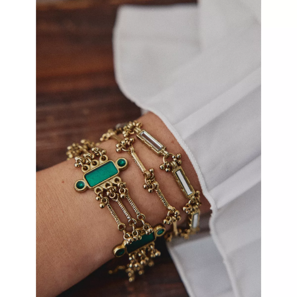 Le bracelet fin indien Meera se met en place facilement sur le poignet grâce à son mousqueton et sa chaîne à maillons réglable.