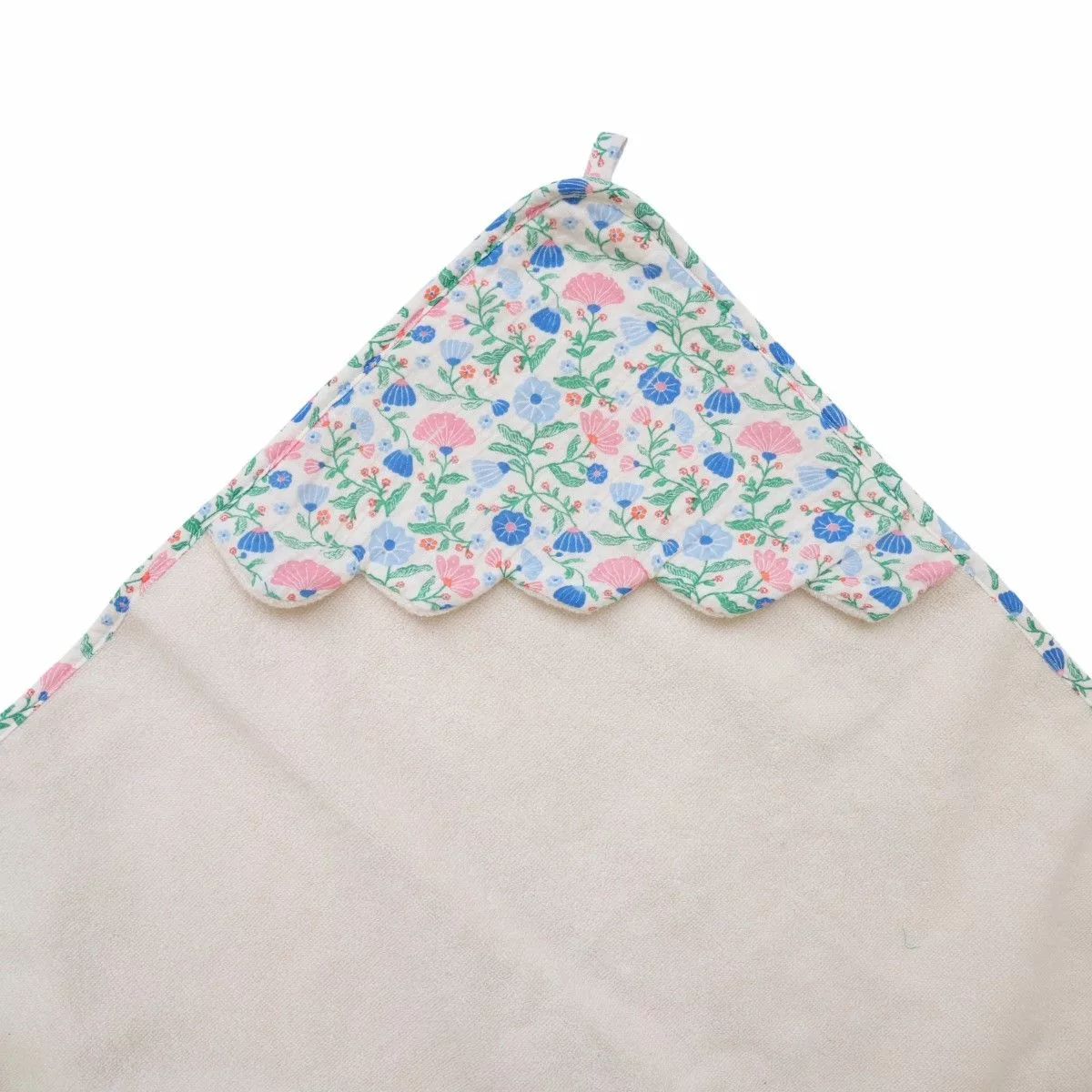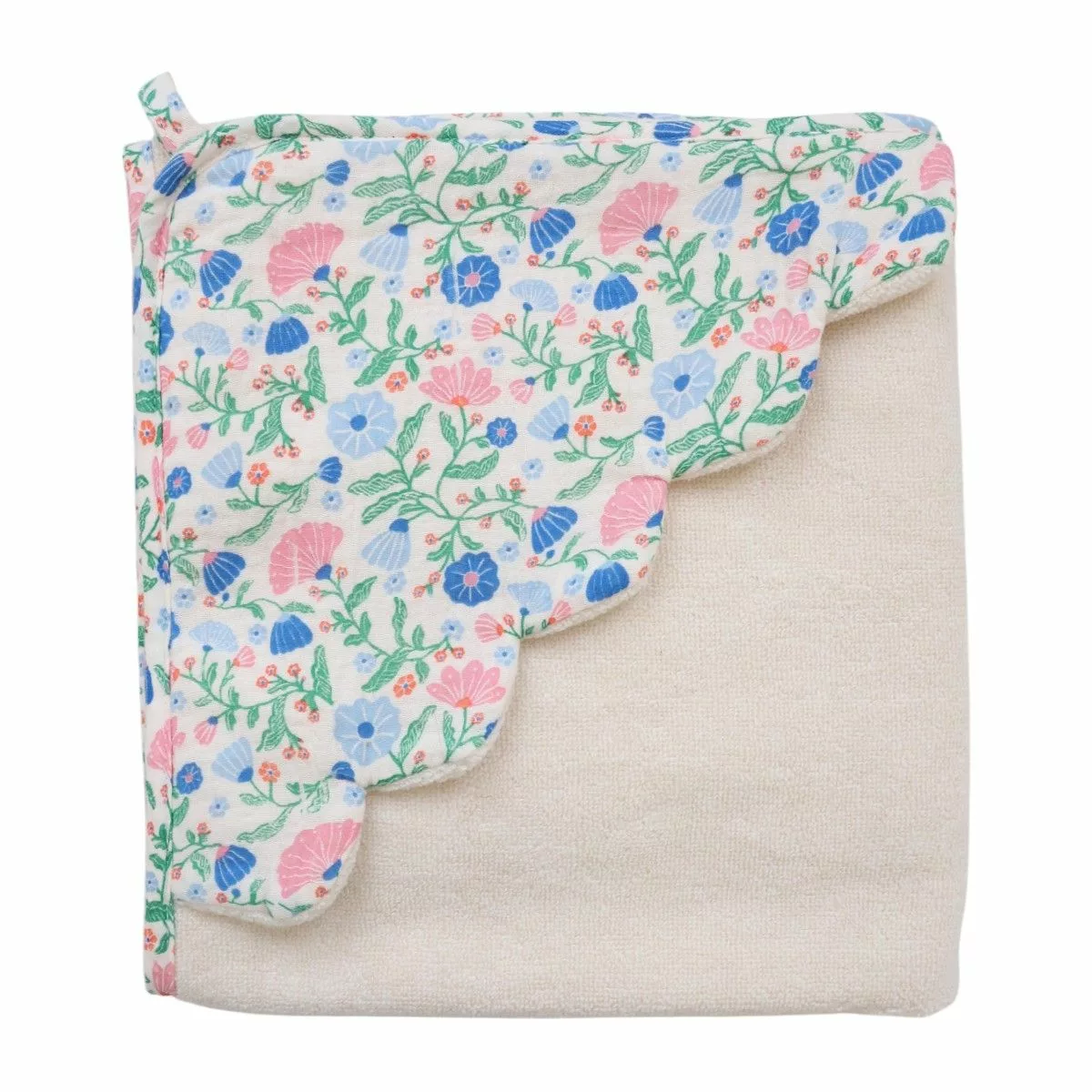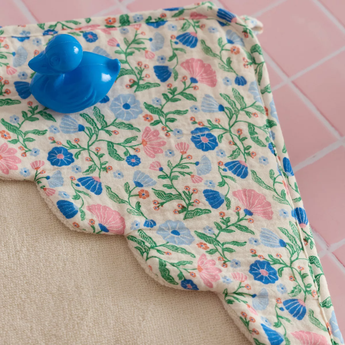 La cape de bain fleurie bleu et rose enveloppe bébé de douceur dès la sortie du bain.