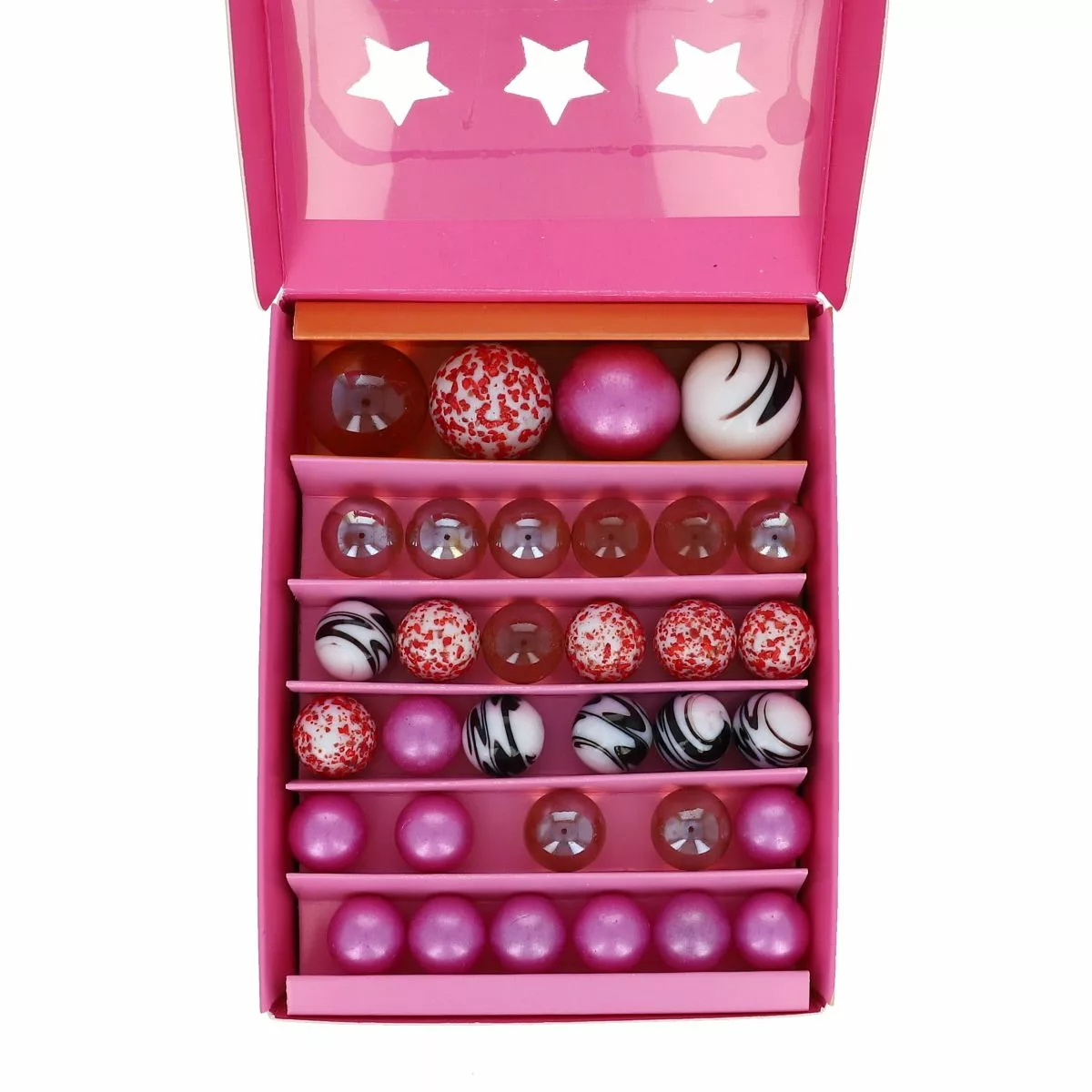 Ce coffret contient 34 billes de couleurs et tailles différentes pour s'amuser à l'infini. Les jolis détails de ces billes colorées vont plaire à tous les petits joueurs dans la cour de récré. Le coffret de billes La Bille en rose contient 4 callots de 25mm et 30 billes de 16mm. Une belle collection à thématique rose, unique pour donner encore plus de plaisir et de sourire aux petits collectionneurs en herbe !